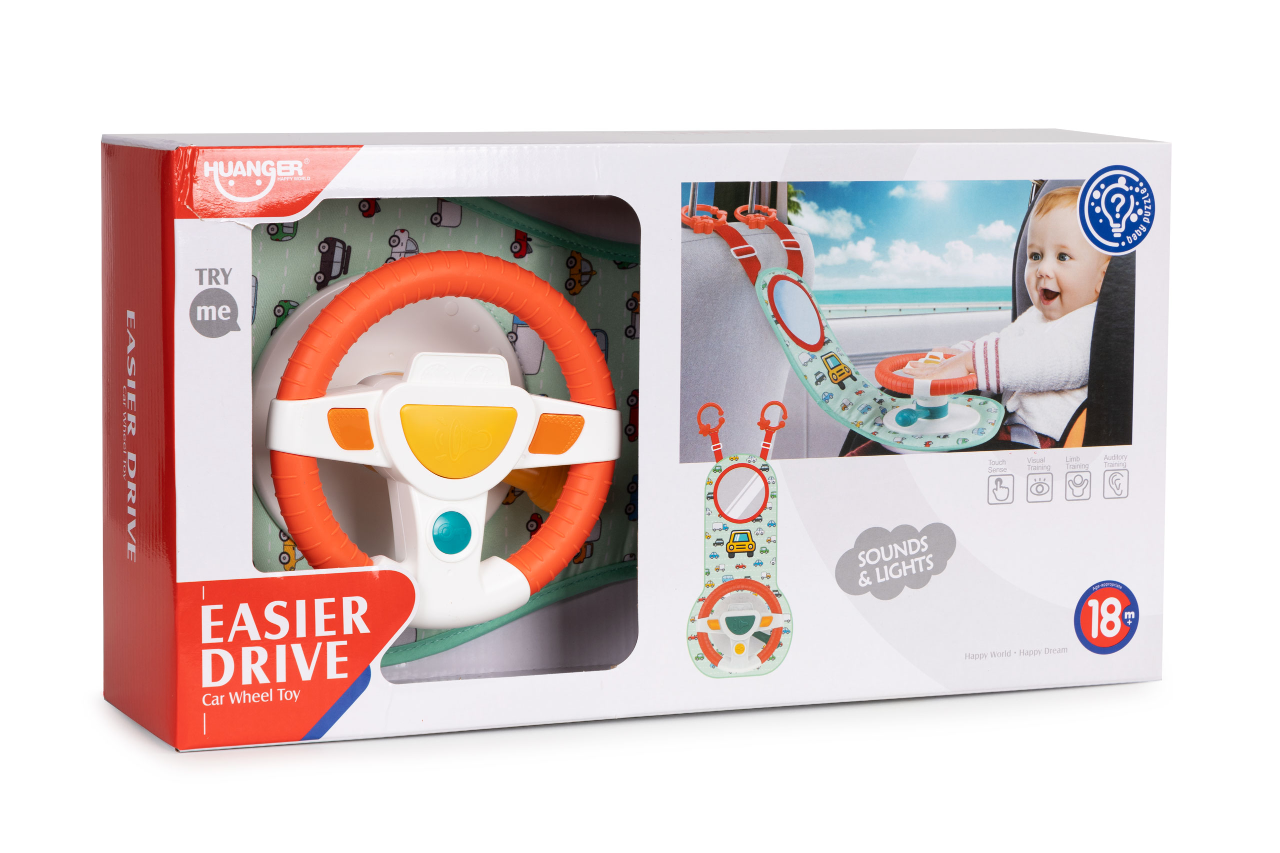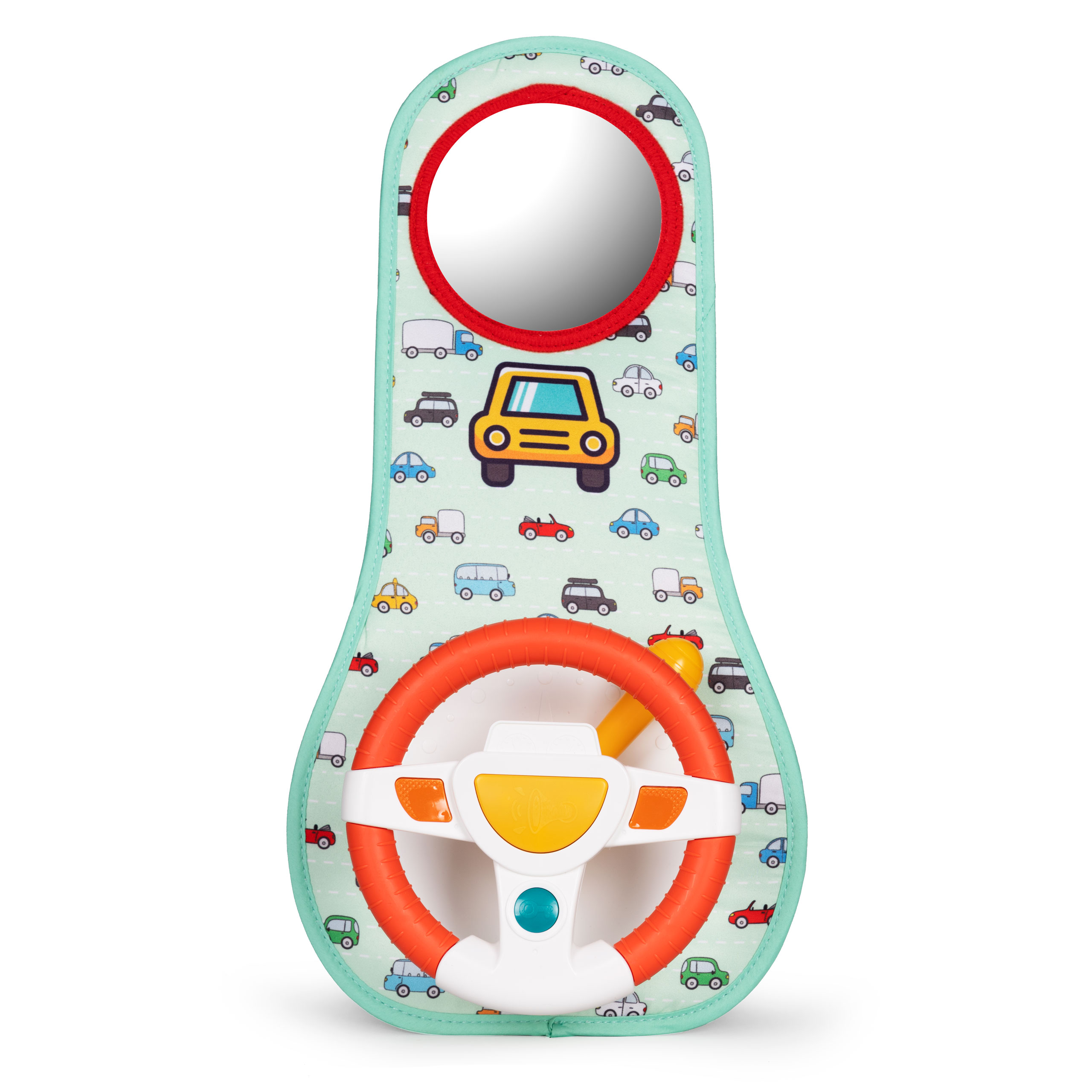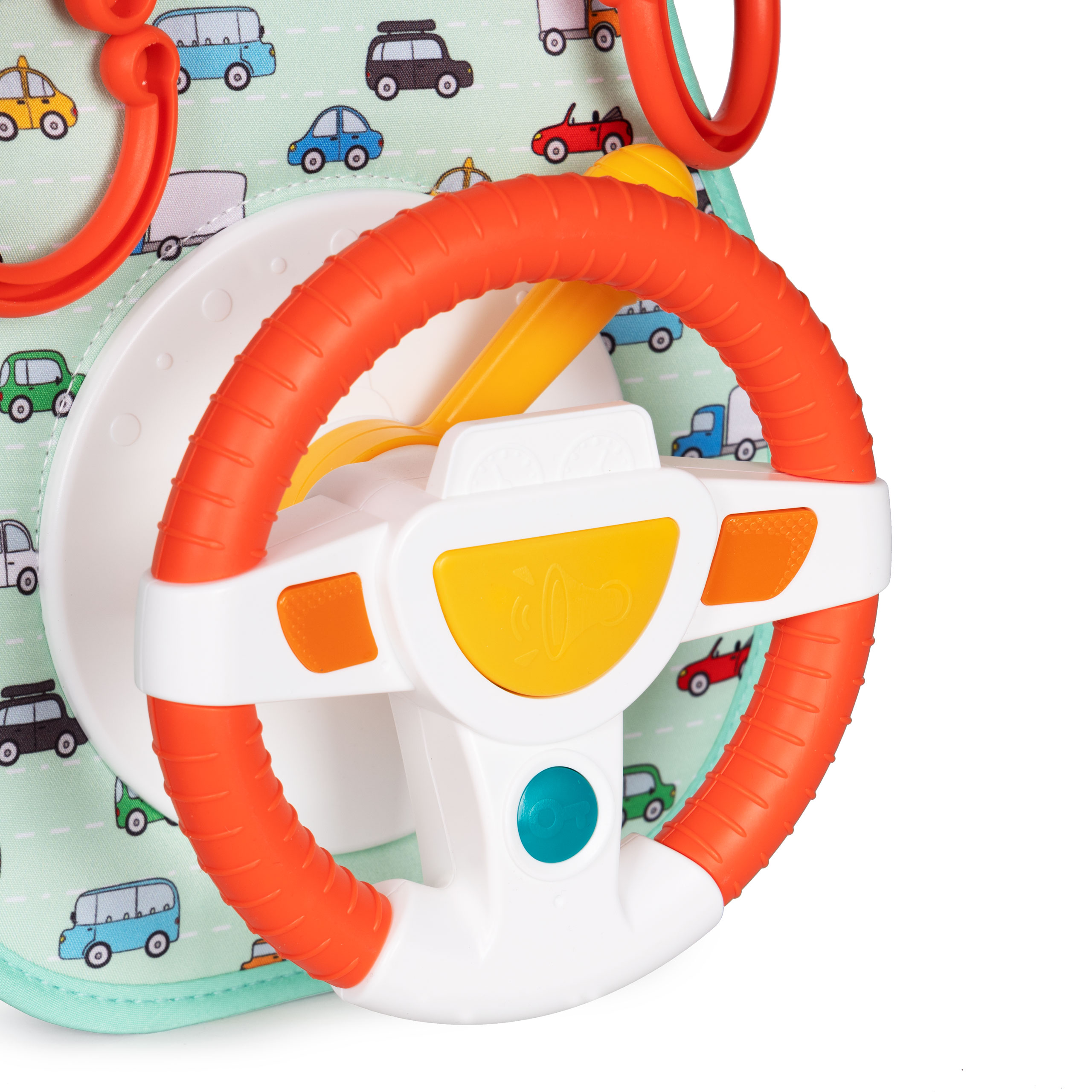 Matę z kierownicą można szybko przypiąć do przedniego fotela za pomocą plastikowych kółek. Dziecko, siedząc w foteliku samochodowym ma dostęp do wiszącej zabawki z możliwością ciągłej zabawy.